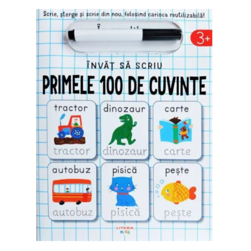 Decolam spre cunoastere! Aceasta carte contine 100 de cuvinte uzuale pe care copiii vor invata sa le scrie. Fiecare cuvant este insotit de un contur punctat, care ghideaza mana copilului in trasarea literelor. Paginile cartii ii permit copilului sa scrie si sa stearga de cate ori doreste.