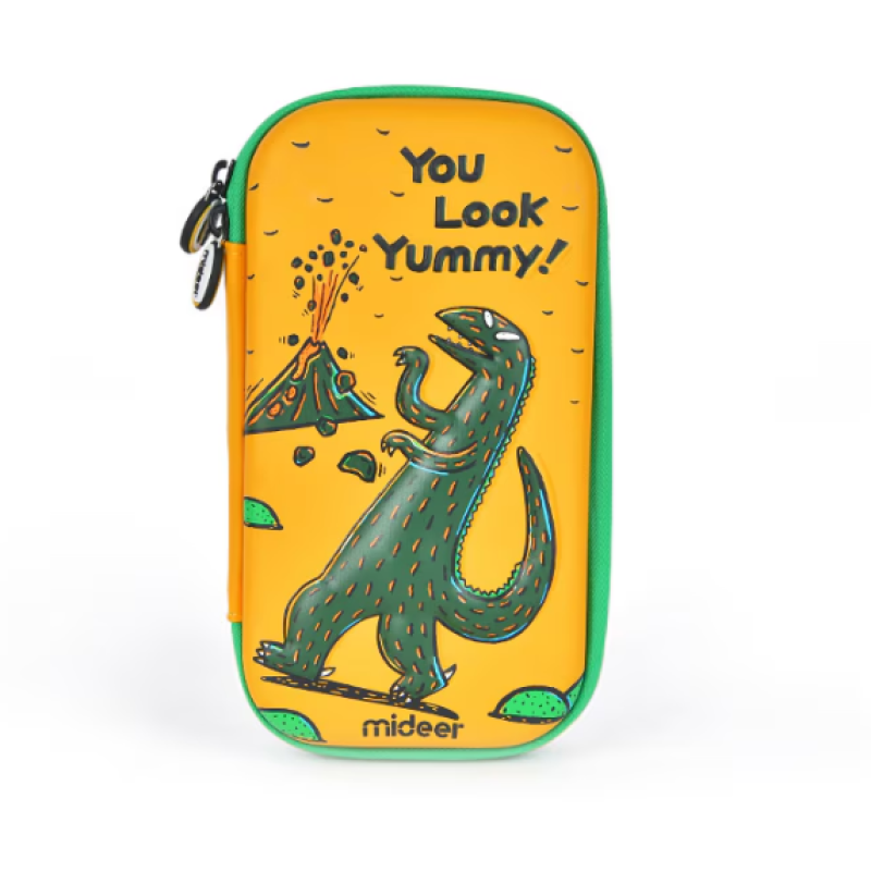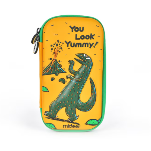 Trusa cu deschidere mare cu motiv Tyrannosaurus rex, figura 3D, rezistenta la apa, invata copiii sa tina lucrurile in ordine, usor de curatat, din material EVA, deschidere cu fermoar cu maner din cauciuc, colturi rotunjite, latime trusa 12,5 cm, greutate 140 g, inclusa in pachet este o rigla de 15 cm, potrivita de la 3 ani.